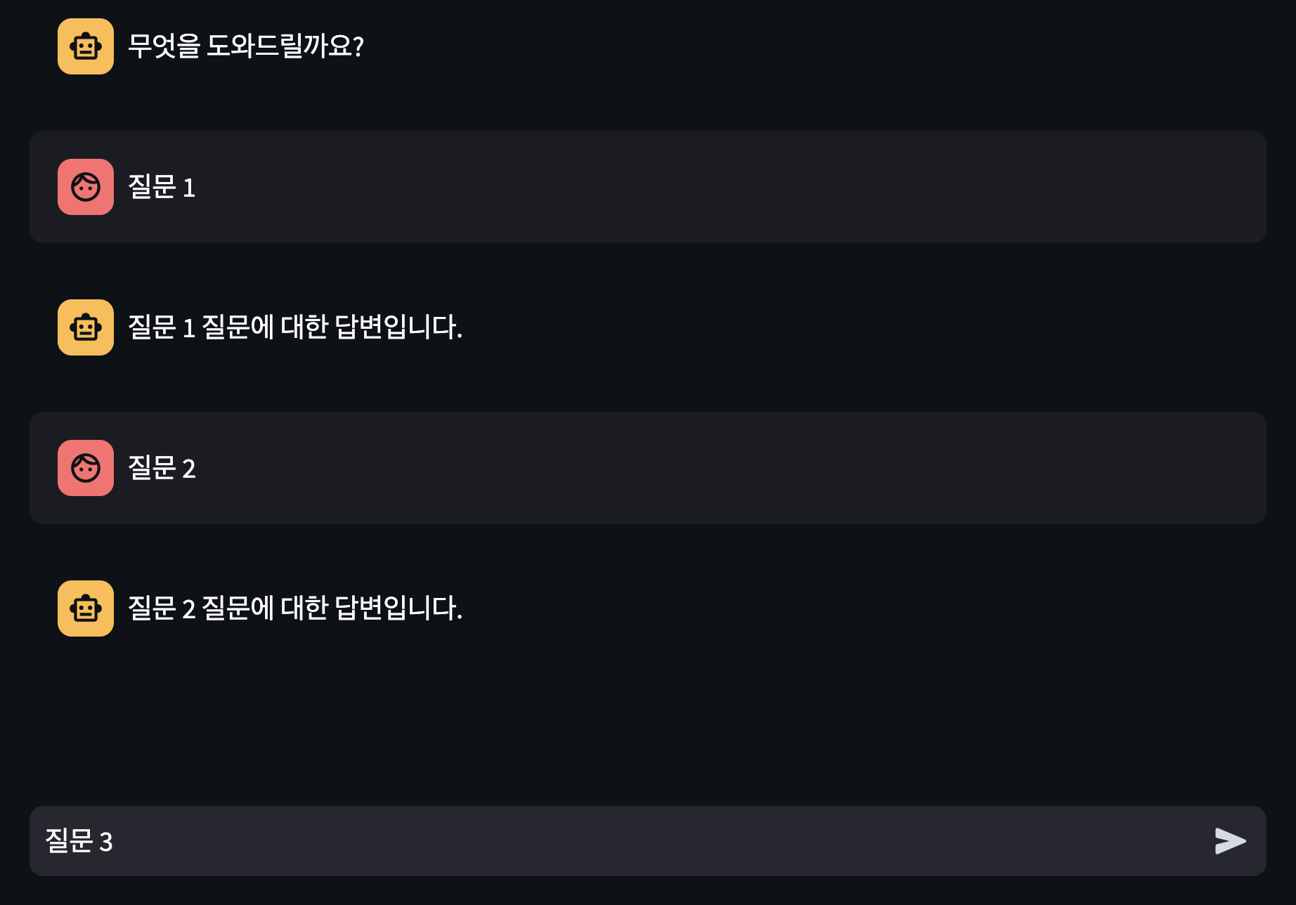 이후 하단 입력창에 질문을 하면 질문과 답변이 화면에 출력되고,